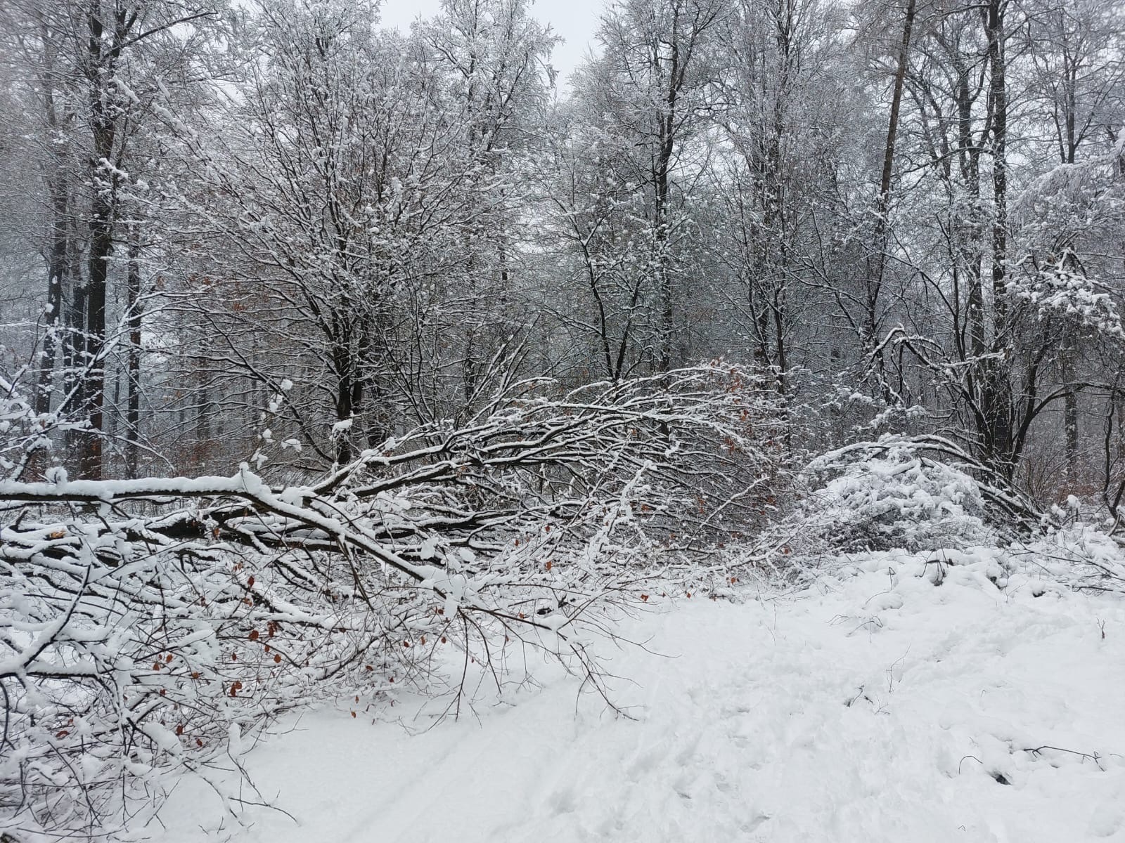 - Bij sneeuwval kunnen boomtakken, maar soms ook hele bomen, breken onder het gewicht van de sneeuw die zich ophoopt in de kroon, of de boom kan omvallen (ook bekend als windworp).